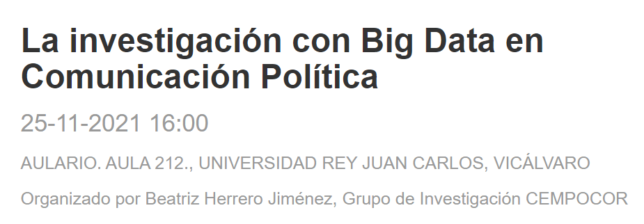 Estas jornadas están dirigidas a los estudiantes de los últimos cursos de Periodismo, Comunicación Audiovisual y Publicidad y RRPP, pues está entroncada con la asignatura de Métodos de Investigación en Comunicación, así como a estudiantes de Máster. Sin embargo, cualquiera interesado/a en el tema puede asistir. En esta conferencia, José Manuel Rodes, técnico de gestión estadística del Instituto Valenciano de Estadística, explicará las técnicas más habituales de tratamiento de grandes datos (Big Data) para hacer análisis sobre temas relacionados con la Comunicación Política, así como la forma de aplicarlos. La investigación con Big Data es el tipo de investigación con más proyección hoy en día en Ciencias de la Comunicación y una formación necesaria para cualquier investigador/a o comunicador.